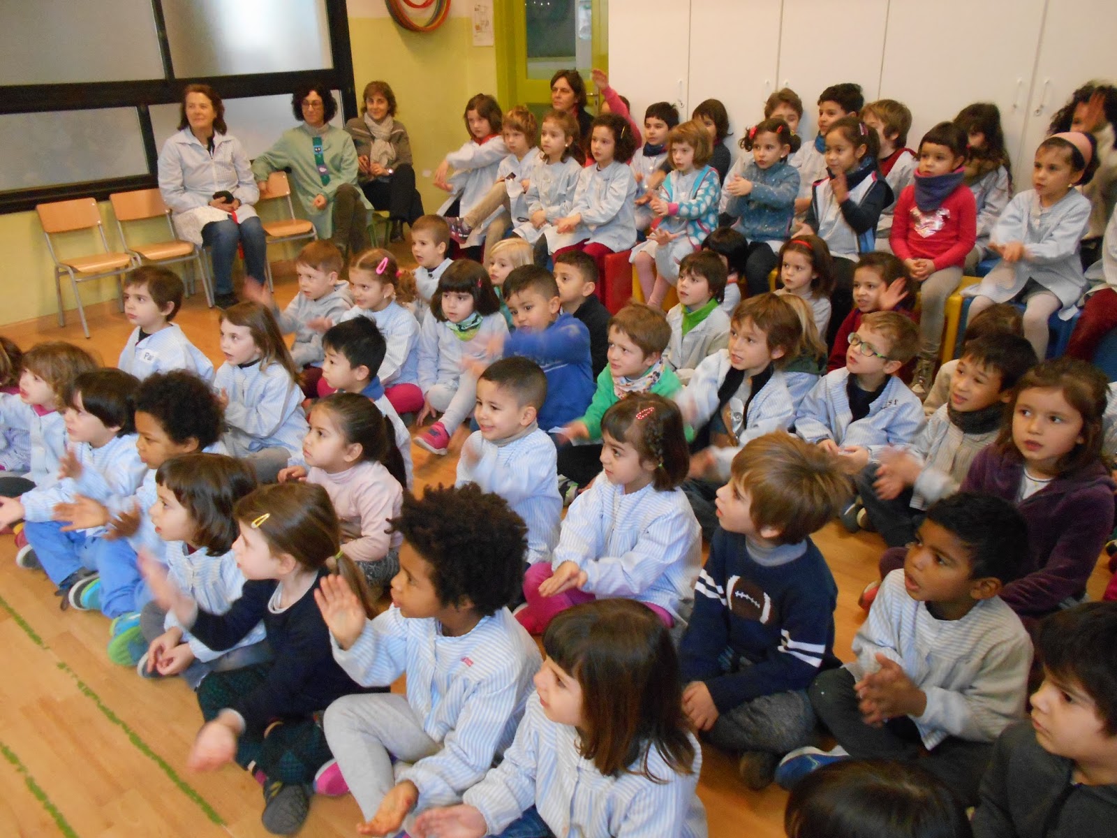 Aquest matí els nens i nenes de P4, P5 i 1r, hem pogut veure un espectacle genial. Han vingut a fer-nos teatre en anglès. El vocabulari i les cançons s'havien treballat prèviament amb la mestra d'anglès (estan penjades al blog d'English).